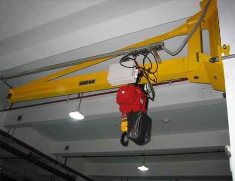 悬臂吊起重机工作强度为轻型,起重机由立柱,回转臂回转驱动装置及电动葫芦组成,立柱下端通过地脚螺栓固定在混凝土基础上,由摆线针轮减速装置来驱动悬臂回转,电动葫芦在悬臂工字钢上作左右直线运行,并起吊重物。起重机旋臂为空心型钢结构,自重轻,跨度大,起重量大,经济耐用。内置式行走机构,采用带滚动轴承的特种工程塑料走轮,摩擦力小,行走轻快;结构尺寸小,特别有利于提高吊钩行程。